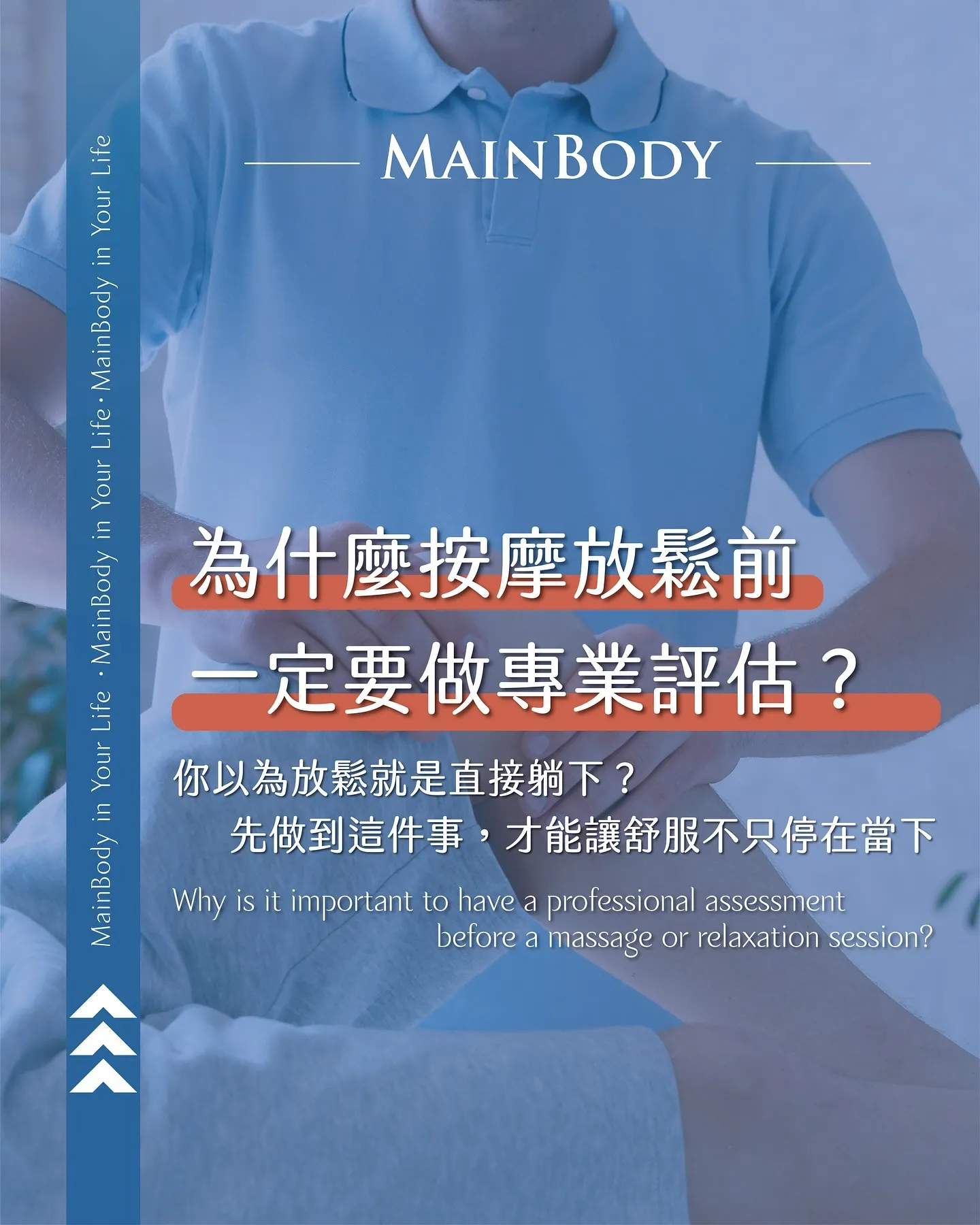 你以為放鬆就是直接躺下開始嗎? 事實上,先「評估」才是讓舒服延續的關鍵。 在 MainBody,我們相信——放鬆不是隨意,而是有計畫的過程。